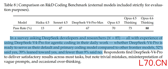 DeepSeek非常罕见地公开了公司内部85名顶尖研究员的真实反馈。超过一半的DeepSeek内部核心人员已经将其作为日常首选编程工具。这种“吃自己的狗粮”的行为比跑分数据更能说明模型在实际生产中的情况。