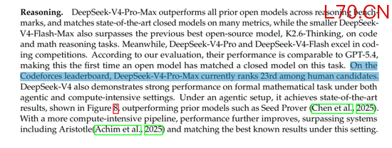 原文为:On the Codeforces leaderboard, DeepSeek-V4-Pro-Max currently ranks 23rd among human candidates.