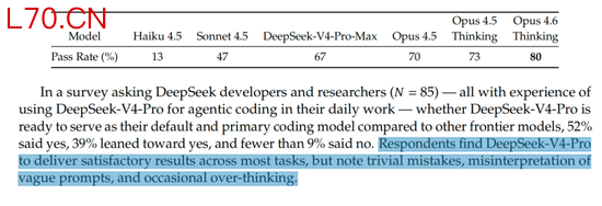 受访者认为DeepSeek-V4-Pro在大多数任务上都能给出令人满意的结果,但也指出它存在一些细小的错误、对模糊提示的理解偏差,以及偶尔的过度思考。