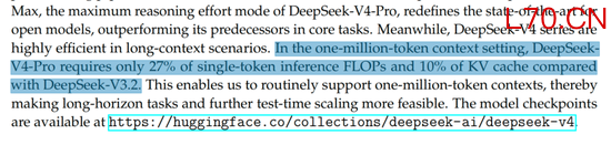 在百万级token上下文设定下,与DeepSeek-V3.2相比,DeepSeek-V4-Pro仅需其27%的单token推理FLOPs,以及10%的KV缓存。