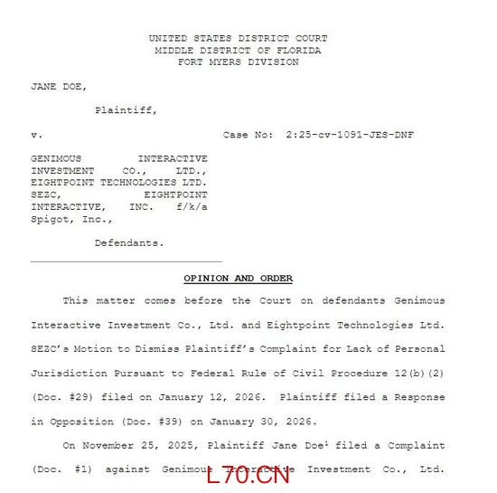 这份由美国佛罗里达州中区地方法院迈尔斯堡分院于2026年2月签署的裁定文件显示,一名27岁的佛罗里达州女性指控遭到名为Hongda Lu的中国公民强奸,并指出Hongda Lu是Genimous Technology Co., Ltd.的董事长。