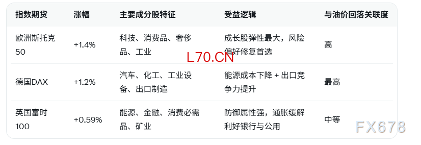 德国等制造业大国高度依赖能源进口,油价与天然气回落直接降低企业生产成本,提升盈利预期。DAX成分股中汽车、化工、工业设备等出口企业受益突出,期货反弹斜率领先。