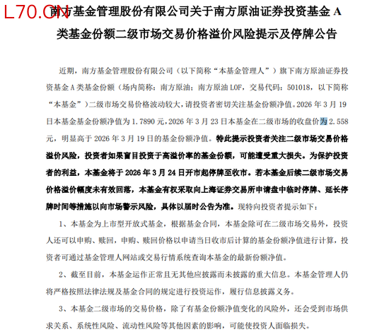 数据提示了问题的严重性。3月23日晚间,原油LOF易方达和嘉实原油LOF晚间发布公告称,3月24日-10:30临时停牌,警示溢价风险,复牌后若溢价未回落,将采取进一步措施。
