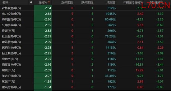 跌幅超2%的有13个板块,其中农林牧渔、电力设备领跌,近日表现不错的医药生物也回调。
