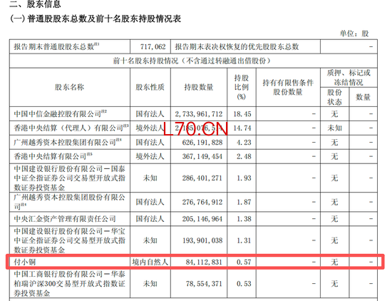 中信证券2026年一季报显示,自然人付小铜持有中信证券0.84亿股A股,持股比例为0.57%,位列第九大股东。