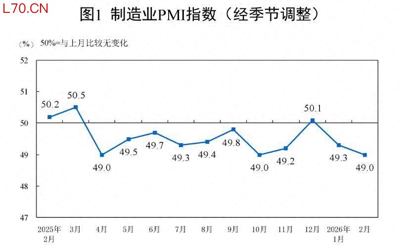 3月4日,国家统计局公布数据显示,2月份,制造业采购经理指数(PMI)为49.0%,比上月下降0.3个百分点;非制造业商务活动指数为49.5%,比上月上升0.1个百分点;综合PMI产出指数为49.5%,比上月下降0.3个百分点。
