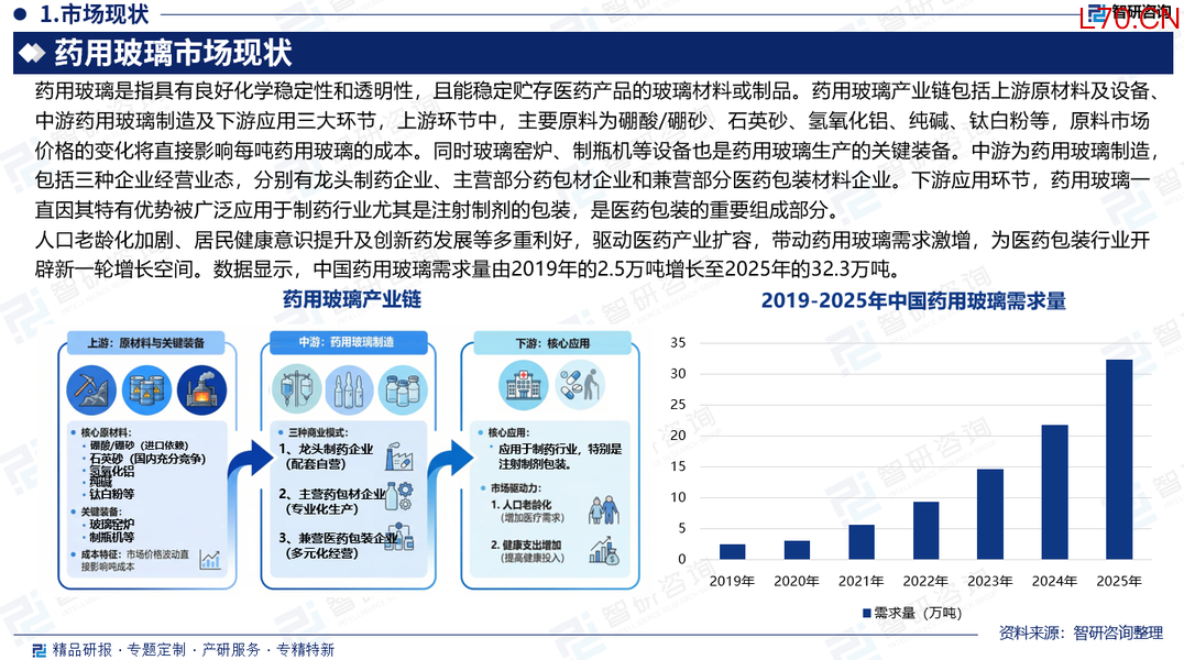 需求量:人口老龄化加剧、居民健康意识提升及创新药发展等多重利好,驱动医药产业扩容,带动药用玻璃需求激增,为医药包装行业开辟新一轮增长空间。数据显示,中国药用玻璃需求量由2019年的2.5万吨增长至2025年的32.3万吨。