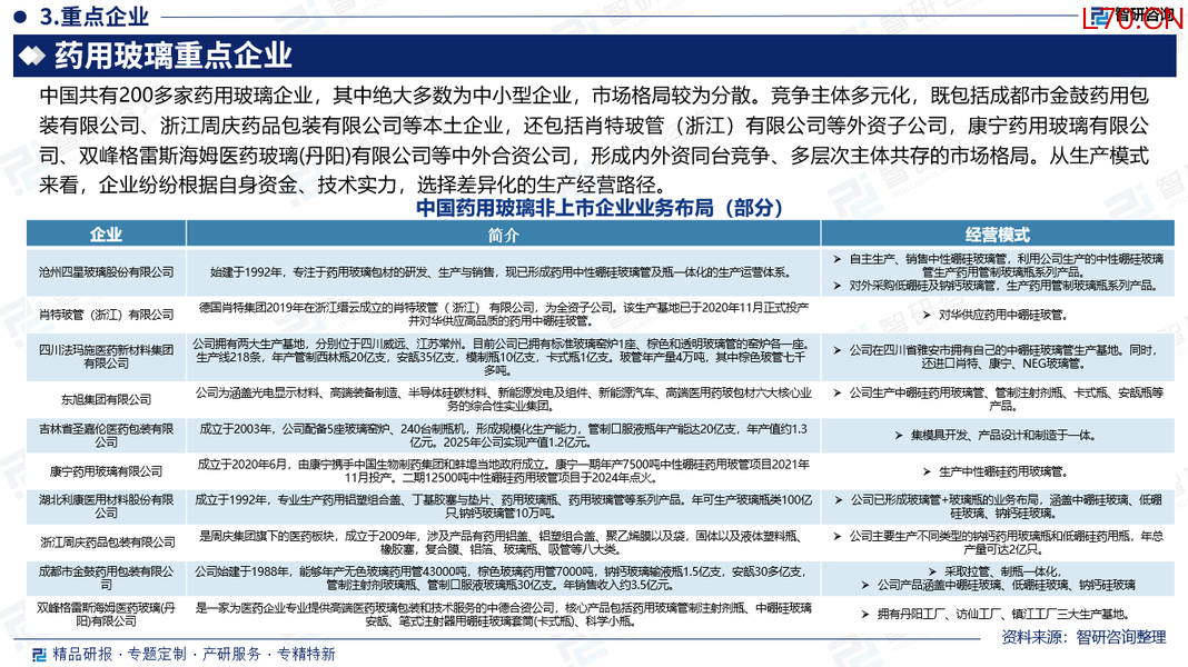 非上市企业布局情况:中国共有200多家药用玻璃企业,其中绝大多数为中小型企业,市场格局较为分散。竞争主体多元化,既包括成都市金鼓药用包装有限公司、浙江周庆药品包装有限公司等本土企业,还包括肖特玻管(浙江)有限公司等外资子公司,康宁药用玻璃有限公司、双峰格雷斯海姆医药玻璃(丹阳)有限公司等中外合资公司,形成内外资同台竞争、多层次主体共存的市场格局。从生产模式来看,企业纷纷根据自身资金、技术实力,选择差异化的生产经营路径,部分企业采取拉管、制瓶一体化模式,抗风险能力更强;部分企业则采取外购玻璃管、再加工制成药用玻璃瓶,专注于制瓶环节,灵活调整产能。