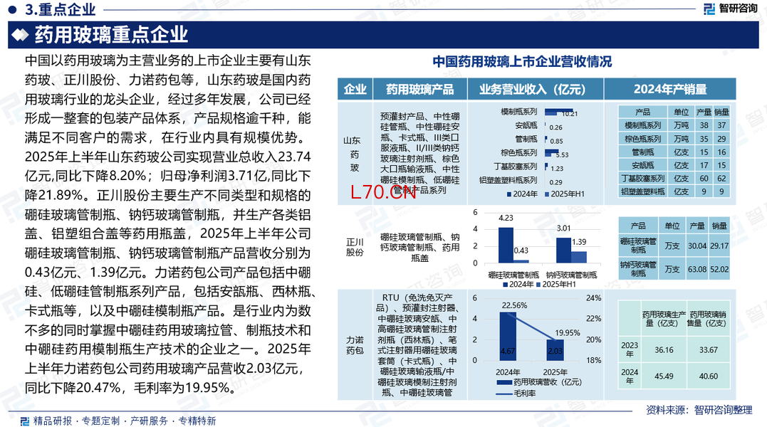 上市企业经营现状:中国以药用玻璃为主营业务的上市企业主要有山东药玻、正川股份、力诺药包等,山东药玻是国内药用玻璃行业的龙头企业,在行业内具有规模优势。2025年上半年山东药玻公司实现营业总收入23.74亿元,同比下降8.20%;归母净利润3.71亿,同比下降21.89%。正川股份主要生产不同类型和规格的硼硅玻璃管制瓶、钠钙玻璃管制瓶,并生产各类铝盖、铝塑组合盖等药用瓶盖,2025年上半年公司硼硅玻璃管制瓶、钠钙玻璃管制瓶产品营收分别为0.43亿元、1.39亿元。力诺药包公司产品包括中硼硅、低硼硅管制瓶系列产品,包括安瓿瓶、西林瓶、卡式瓶等,以及中硼硅模制瓶产品。是行业内为数不多的同时掌握中硼硅药用玻璃拉管、制瓶技术和中硼硅药用模制瓶生产技术的企业之一。2025年上半年力诺药包公司药用玻璃产品营收2.03亿元,同比下降20.47%,毛利率为19.95%。