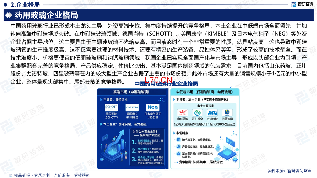 竞争格局:中国药用玻璃行业已形成本土龙头主导、外资高端卡位、集中度持续提升的竞争格局,本土企业在中低端市场全面领先,并加速向高端中硼硅领域突破。在中硼硅玻璃领域,德国肖特(SCHOTT)、美国康宁(KIMBLE)及日本电气硝子(NEG)等外资企业占据主导地位。而在技术难度小、价格更便宜的低硼硅玻璃和钠钙玻璃领域,我国企业已实现全面国产化与市场主导。目前国内包括山东药玻、正川股份、力诺特玻、四星玻璃等在内的较大型生产企业占据了主要的市场份额,此外市场还有大量的销售规模小于1亿元的中小型企业,整体呈现头部集中、尾部分散的竞争格局。