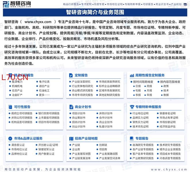 智研咨询专注产业咨询十七年,是中国产业咨询领域专业服务机构。公司以“用信息驱动产业发展,为企业投资决策赋能”为品牌理念。为企业提供专业的产业咨询服务,主要服务包含精品行研报告、专项定制、月度专题、市场地位证明、专精特新申报、可研报告、商业计划书、产业规划等。提供周报/月报/季报/年报等定期报告和定制数据,内容涵盖政策监测、企业动态、行业数据、企业排行、产品价格变化、投融资概览、市场机遇及风险分析等。