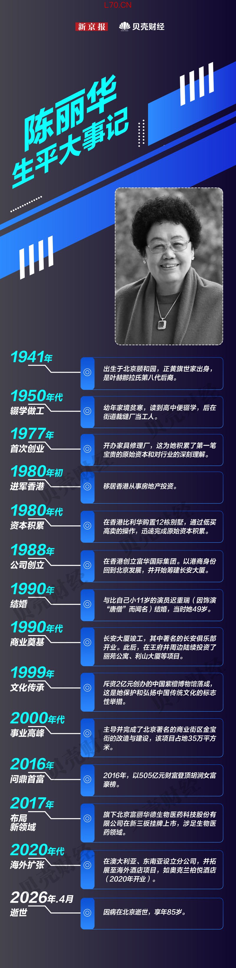 4月7日,富华国际集团发布讣告,富华国际集团荣誉主席、中国紫檀博物馆馆长陈丽华女士因病医治无效,于2026年4月5日在北京逝世,享年85岁。