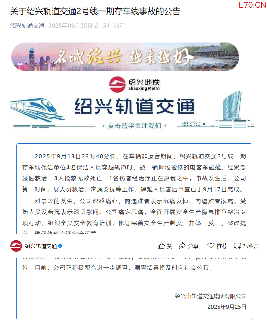 绍兴通报地铁深夜撞人事件:3人抢救无效死亡